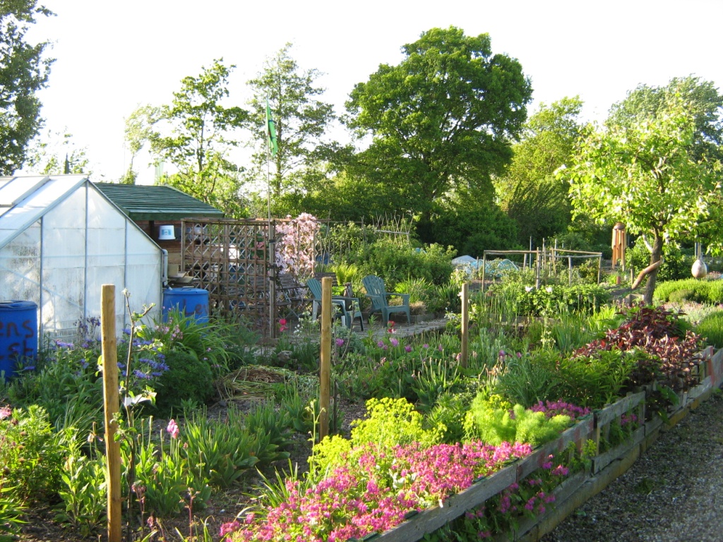 Wat een verschil weer met het rondje complex begin april. Het is groen op volkstuin Levenslust ! Er komt van alles op aan groente en overal zie je netten ter bescherming van de vogels. Het lijkt wel of de bloemen even een adempauze nemen om te wachten tot de Open Dag, maar die paar bloemen die er zijn, zijn extra mooi !
