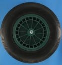 Dit kruiwagenwiel wordt compleet geleverd; massieve band, kunststof velg, as met metalen naaldlager en bevestigingboutjes.