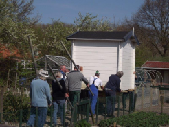 Er wordt gefreesd, de kleikluiten moeten fijn en dat is eigenlijk al te laat: de grond had .al vol moeten staan met plantjes. De aardappelen hadden allang in hun bedjes moeten liggen. Bij de erwten, die al goed gegroeid zijn, moet rijshout geplant worden, zodat ze omhoog kunnen klimmen. Bamboestokken en buizen moeten al in de grond gedreven zijn. Netten gespannen. Wat de een naar de stort brengt, gebruikt de ander hier met plezier: oude elektriciteitsbuizen worden gebogen in de grond gezet. Ze dienen als geraamten voor tunnels en .netten. Afgedankte golfplaten dienen als afscheiding, beddenspiralen zijn klimrekken voor planten; stukken PVC-pijp worden kragen voor koolplanten, oude ramen worden een broeikas. Vorige week zaterdag was er opeens een oud tuinhuis dat verplaatst moest worden.